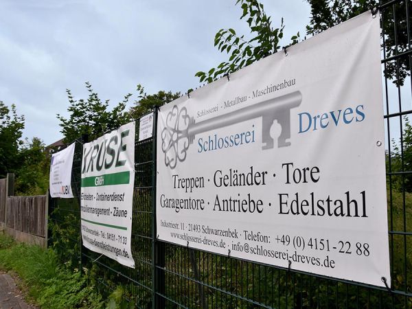 Der WVS Banner-Zaun besteht aus insgesamt 3 Elementen und steht am Zubringer zwischen Kerntangente und Möllner Straße (rechts zur Möllner Straße hoch).